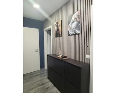 Das gemütliche Schlafzimmer mit einer Fläche von 16 m² verfügt über einen begehbaren Kleiderschrank mit praktischen Regalen für die Aufbewahrung vieler Dinge und einem beleuchteten Spiegel. Ein Doppelbett (kann bei Bedarf erworben werden) sowie ein 40 Zoll-Fernseher sind ebenfalls vorhanden.