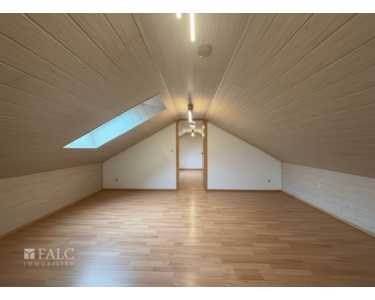 Über eine Treppe erreichen Sie das ausgebaute Dachgeschoss. Dieser Bereich eignet sich hervorragend als Rückzugsort, Studio oder für zwei weitere Schlafzimmer. Die Dachschrägen verleihen dem Raum eine gemütliche, wohnliche Atmosphäre.