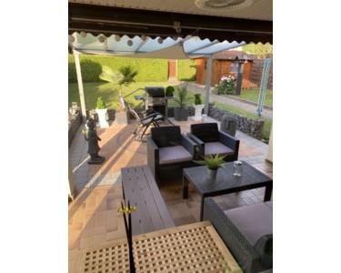 1 Garage, 1 Carport, 1 Gartenhaus, 1 Geräte-/Holzschuppen, 3 Bäder, 2 Einbauküchen, Hobbyraum, großer Keller und 2 überdachte Terrassen mit Markisen.