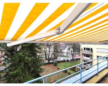 Die Terrasse ist ca. 20 qm gross und hat 2 Markisen.