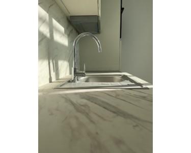 Hochwertige Materialien wie Natursteinfliesen und Fischgrätenparkett aus heller Eiche setzen luxuriöse Akzente.