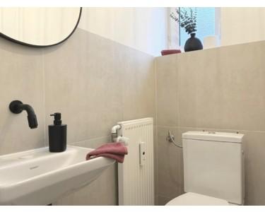 Das neu gestaltete Tageslichtbad ist mit modernen Fliesen, einer großzügigen Regendusche, einem beleuchteten Spiegel sowie neuen Armaturen ausgestattet. Ergänzt wird das Raumangebot durch ein separates WC mit Fenster, das ebenfalls stilvoll renoviert wurde.