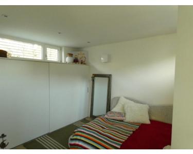 Im großzügigen Schlafzimmer (ca. 12 m²) ist ein Einbauschrank vorhanden und zwei Tageslichtfenster (Oberlichter) an gegenüberliegenden Seiten, die viel Helligkeit erzeugen.