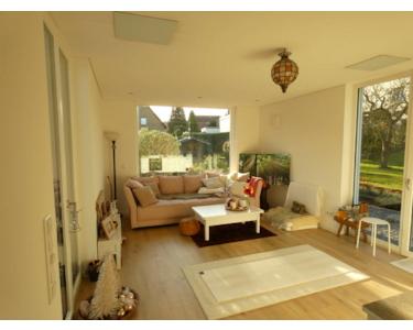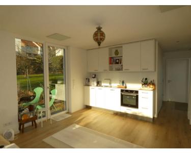 Die raumhohen Fensterelemente erschaffen eine erstaunliche Großzügigkeit und Helligkeit von Wohnraum mit integrierter Küche. Von hier aus haben Sie Zugang auf die Terrasse und in den idyllisch angelegten Garten.