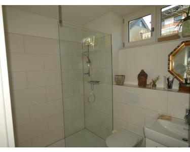 Das Bad ist mit einer sehr geräumigen ebenerdigen Dusche und Tageslichtfenster (Oberlicht) ausgestattet.