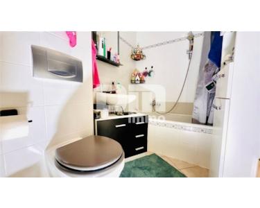 Das innenliegende Badezimmer ist in zeitlosem Design pflegeleicht gefliest und mit einer kompakten Badewanne ausgestattet.