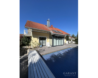 Dieses einladende freistehende Einfamilienhaus verzaubert schon beim ersten Blick mit seiner warmen Atmosphäre und dem großzügigen Grundriss. Auf ca. 164 m² Wohnfläche erleben Sie modernes Wohnen auf drei Ebenen, ergänzt um einen uneinsehbaren Außenbereich mit Sonnenterrasse und Außenpool.