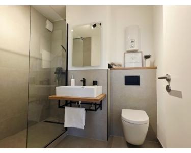 Das Duschbad fügt sich harmonisch in das Gesamtkonzept der Wohnung ein. Der skandinavische Stil, kombiniert mit schwarzen Akzenten im Bad, verleiht der Wohnung eine moderne und zeitlose Eleganz.