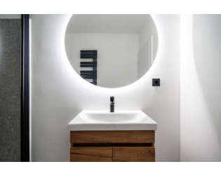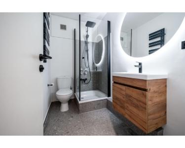• Badezimmer: Modernes Design mit Terrazzo-Fliesen, eigener Waschmaschinenanschluss, neue Dusche und WC, stylischer LED Spiegel und gegenüber der neue Handtuchheizer