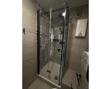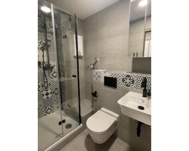 - Badezimmer mit Dusche, WC und beleuchtetem Spiegel