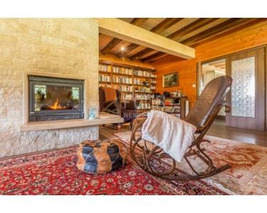 Im Erdgeschoss: großes Wohnzimmer mit Kamin, Bibliothek und Zugang zur überdachten Terrasse mit Blick auf Wiesen, Pinienwälder oder Schneelandschaften im Winter.