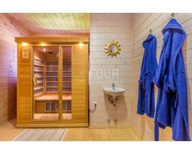 Im Obergeschoss: 6 Schlafzimmer mit eigenen Bädern und Infrarot-Sauna.