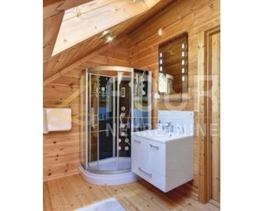In der unteren Etage befinden sich eine Küche, ein Wohnzimmer, ein Schlafzimmer, ein Badezimmer und eine Terrasse, während sich in der oberen Etage drei Schlafzimmer mit eigenen Badezimmern und eine komplett eingerichtete Galerie befinden, ideal zum Entspannen und geselligen Beisammensein.