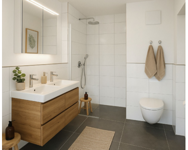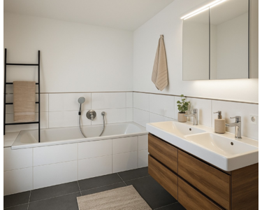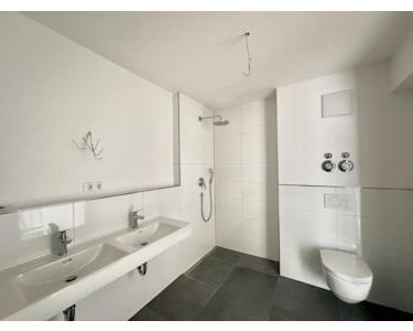 Das Badezimmer ist ein echtes Highlight: Es erwartet Sie eine Badewanne, zwei Waschbecken und eine begehbare Dusche. Die Wandfliesen in edlem Weiß und die Bodenfliesen in zeitlosem Grau verleihen dem Raum eine hochwertige und stilvolle Note. Der gesamte Bereich schafft eine luxuriöse und gleichzeitig entspannte Atmosphäre – ein Ort, an dem Sie gerne Zeit verbringen.