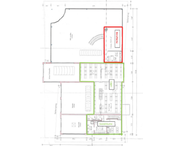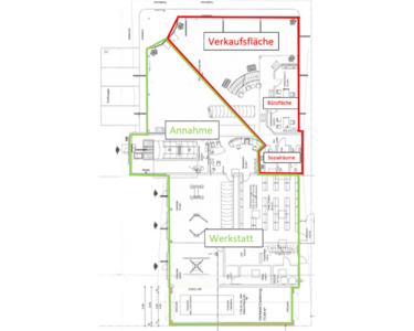 •Erweiterbar um Werkstatt: Angrenzend an die Büro-und Ausstellungsfläche befindet sich eine 670 m² große Werkstatt inkl. Lagerfläche, Sozialräume und großer Annahmefläche (Fläche auf dem Grundriss in grün markiert), welche optional ebenfalls mitvermietet werden kann.