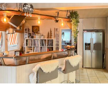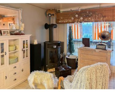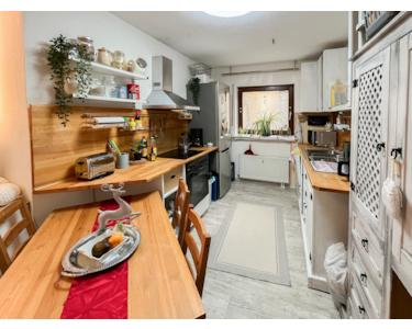 Im Erdgeschoss erwartet Sie eine gut ausgestattete Einbauküche, die offen in den Essbereich übergeht – ideal für gesellige Stunden. Ein komfortables Bad und ein gemütliches Schlafzimmer ergänzen den Grundriss. Das Wohnzimmer mit Kamin schafft besonders im Winter eine warme Atmosphäre und bietet Zugang zum sonnigen Balkon.