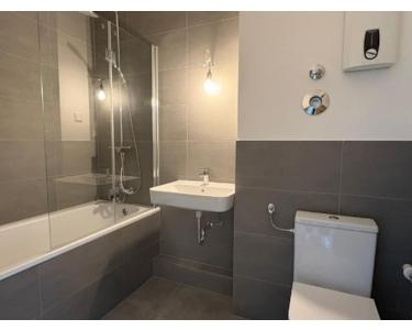Die Bäder sind grau gefliest mit weißen Sanitäranlagen.