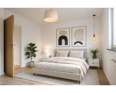 Angrenzend an das Wohnzimmer erreichen Sie den separaten Schlaftrakt, der eine klare Abgrenzung zu den beiden Schlafzimmern und dem innenliegenden Bad schafft, das mit Wanne und WC ausgestattet ist.