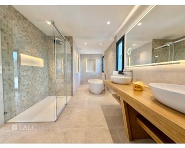 Insgesamt stehen sechs komfortable Schlafzimmer und sieben hochwertig ausgestattete Badezimmer zur Verfügung. Die moderne Einbauküche, elegante Fliesenböden und die Fußbodenheizung unterstreichen den hochwertigen Charakter der Immobilie. Barrierefreiheit sowie eine klare, funktionale Struktur machen das Anwesen auch langfristig zu einem komfortablen Lebensmittelpunkt.