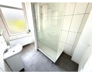 • Duschbad: weiß/grau gefließtes Badezimmer mit zeitgemäßer Gestaltung