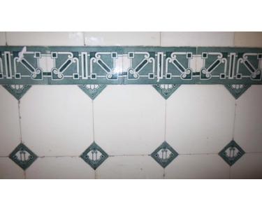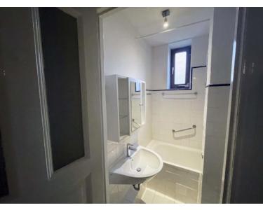 Vollbad mit Tageslichtfenster, Pitchpine-Dielenböden, Original-Fliesen, hohe Altbau-Decken mit Stuckelementen, Nachtspeicher-Heizung