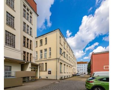 Neben zahlreichen Stellplätzen für Mitarbeiter und Besucher verleiht ein kleiner Park dem Areal zusätzlichen Charme und sorgt für eine angenehme Atmosphäre.