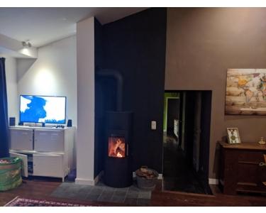 Für zusätzliche Behaglichkeit sorgt ein hochwertiger Kaminofen (2016) im offenen Wohnbereich, der an kalten Tagen eine gemütliche Atmosphäre schafft und Heizkosten senkt.
