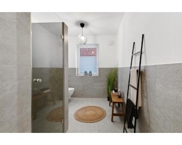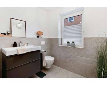 Das Tageslichtbad erhält hochwertige Fliesen und wird mit einer ebenerdigen Dusche ausgestattet.