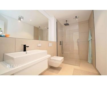 Das herrliche und moderne Badezimmer lässt keine Wünsche mehr offen. Begrüßt werden Sie hier von einer ebenerdigen, breiten Dusche mit Glaswand. Ein großzügiger Waschtisch darf natürlich nicht fehlen. Freuen Sie sich auf erholsame Wellness-Abende zu Hause.