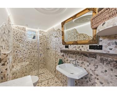 Schon beim Betreten spürt man die besondere Atmosphäre: Das Untergeschoss empfängt mit einem einladenden Flurbereich, einem kompakten Tageslichtbad mit Badewanne und Waschmaschinenanschluss, einem gemütlichen Schlafzimmer mit bodentiefem Fenster sowie einem von außen begehbaren Hauswirtschaftsraum – praktisch und zugleich elegant gelöst.