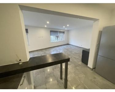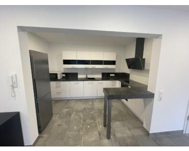 Neuwertig mit großen Designerfliesen, Fußbodenheizung und komplett ausgestatteter Einbauküche mit Waschmaschine, Spülmaschine und großem Kühlschrank.