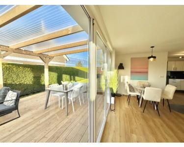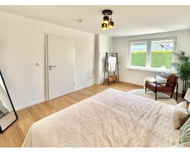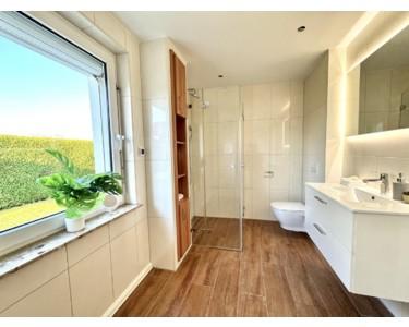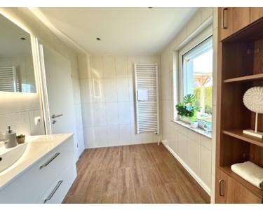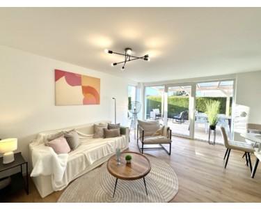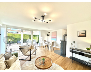 Im Zentrum steht der großzügige Wohn‑ und Essbereich mit bodentiefen Fenstern zur neu angelegten, überdachten Terrasse. Die offen gestaltete Einbauküche fügt sich harmonisch in den Raum ein und schafft eine angenehme Wohnatmosphäre – ideal für geselliges Beisammensein. Ein gemütlicher Kamin sorgt in der kühleren Jahreszeit für behagliche Wärme.