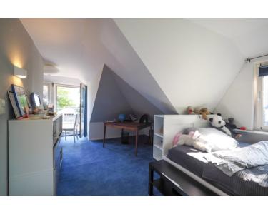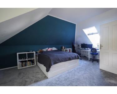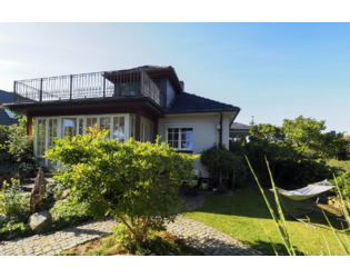 Eine geschwungene Holztreppe führt ins Dachgeschoss. Hier gibt es zwei große Zimmer und ein weiteres Duschbad. Von einem der Zimmer gelangt man auf den Balkon mit herrlichem Blick in den schönen Garten.