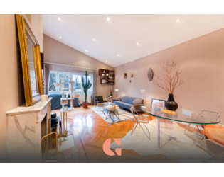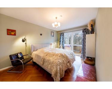 Das lichtdurchflutete Wohnzimmer beeindruckt mit einer Raumhöhe von bis zu 4 Metern sowie einem offenen Marmorkamin, der dem Raum eine elegante und zugleich warme Note verleiht. Der edle Fischgrät-Teakholzparkett (Vollholz) Boden, der sich über Wohnzimmer und Schlafzimmer erstreckt, unterstreicht den exklusiven Charakter der Wohnung.