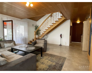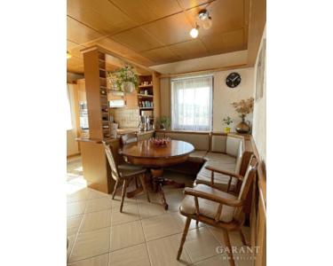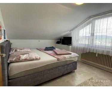 Im Obergeschoss erwarten Sie zwei gemütliche Schlafzimmer, eine Küche mit Einbauküche und angeschlossenem Essplatz, ein Bad mit WC und Dusche sowie ein großzügiges, lichtdurchflutetes Wohnzimmer mit Zugang zum einladenden Balkon - ideal zum Entspannen an sonnigen Tagen.