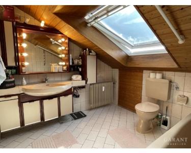 Eine stilvolle Holztreppe führt ins Dachgeschoss, das mit einem weiteren Schlafzimmer, einem separaten Ankleidezimmer und einem komfortablen Tageslichtbad mit Badewanne zusätzlichen Wohnkomfort bietet.