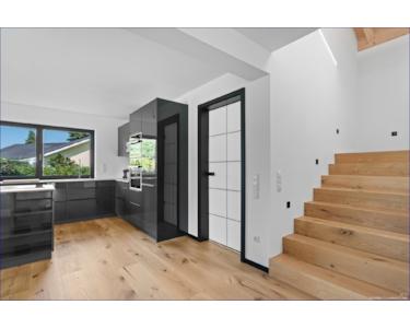 Hochwertige Glas/Metall-Eingangstüren in den offenen, lichtdurchfluteten Wohnraum mit neuer Küche.