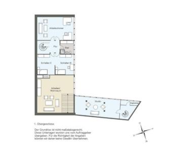 Auf 2 Etagen erschließen sich Wohn-Schlaf- und Arbeitsbereiche. Die offene Küche mit angrenzendem offenen Essbereich und dem Gemütlichen Kachelofen werden zum Treffpunkt des Hauses. Der angrenzende Wohnbereich beeindruckt durch die imposante Glasfassade und den Ausblick in den Innenhof, sowie einem offenen Kamin. Die offene Holztreppe führt über eine Empore in das ausgebaute Dachgeschoss und erschließt einen zusätzlichen hellen großen Wohnraum und oder Bürobereich.