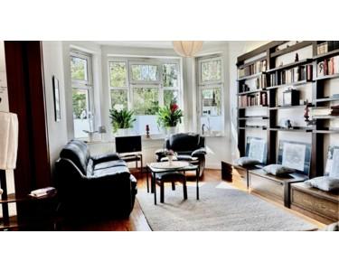 Unsere großzügige 4-Zimmer-Wohnung in Hamburg-Niendorf, in einer ruhigen Seitenstraße mit Einzelhäusern, befindet sich im Erdgeschoss einer Stadtvilla von 1913. Die Wohnung hat zwei Terrassen, eine mit einem kleinen Rasenstück und eine angebunden am Wintergarten, dessen Fenster sich vollständig öffnen lassen.
