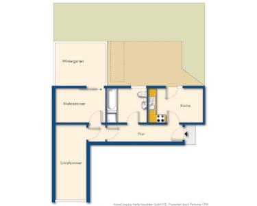 Aufgeteilt in Flur, Wohnküche mit Terrasse, Schlafzimmer sowie Wohnzimmer mit Wintergarten. Das Bad mit Wanne und Dusche.