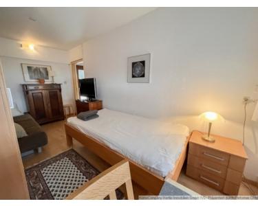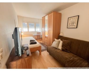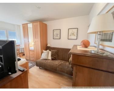 Einpersonen-Bett, Schlafsofa, Beistellregal mit Schubladen und kleiner Lampe, Schreibtisch mit Stuhl, TV mit Kabel-Anschluß auf Kommode, Kleiderschrank mit Spiegeltüre, große Kommode.