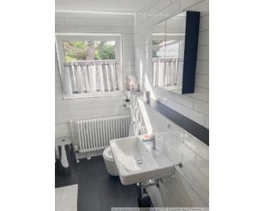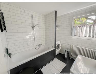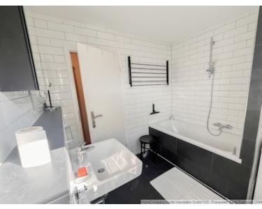 Dusche,Wanne, Waschbecken, WC, Waschmaschine-Trockner-Kombination,Hängeschrank mit Tür.
