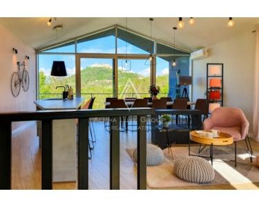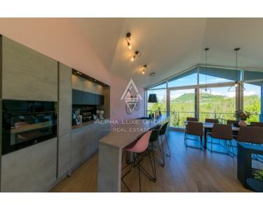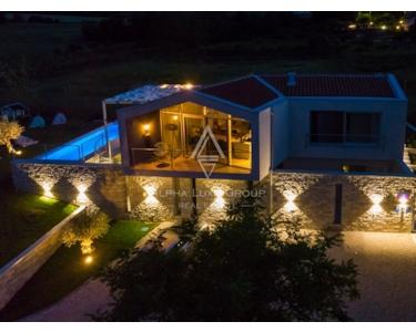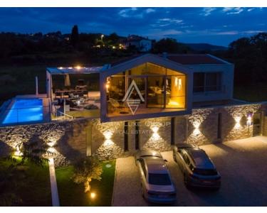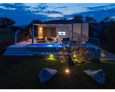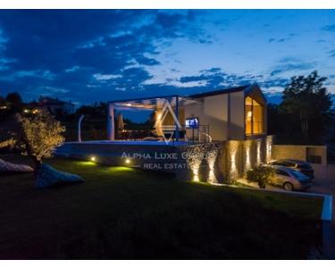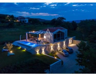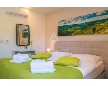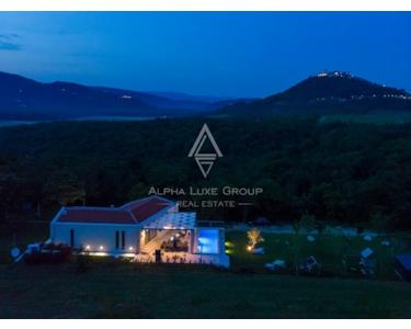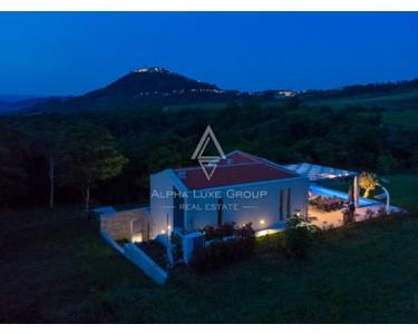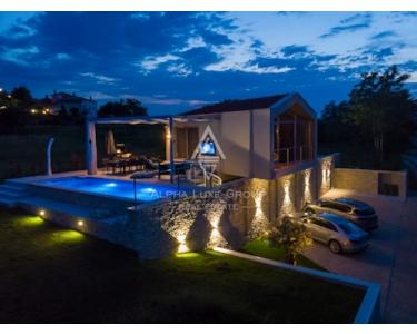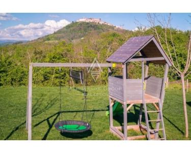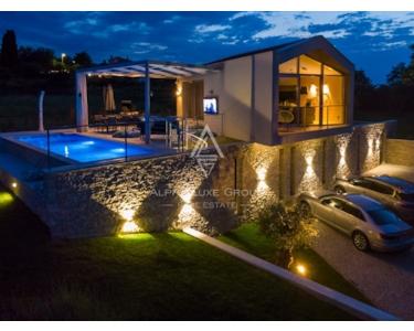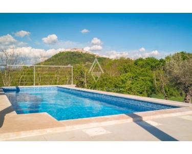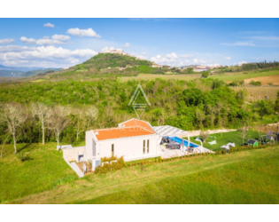In außergewöhnlich ruhiger Lage befindet sich eine besondere Villa mit modernem Konzept, die sich durch ihren unkonventionellen Grundriss und den weiten Blick über Motovun und die umliegende Landschaft auszeichnet.