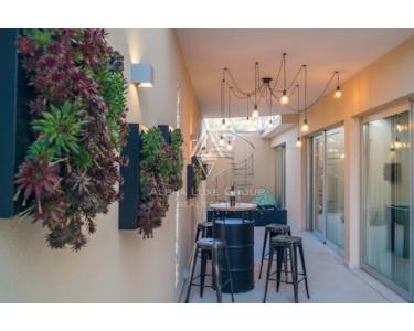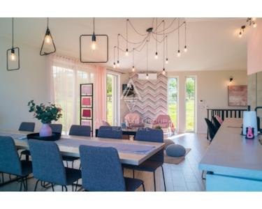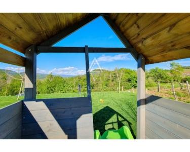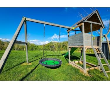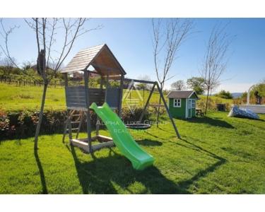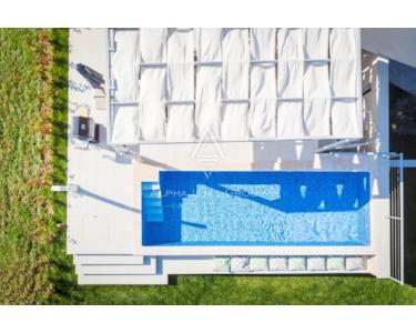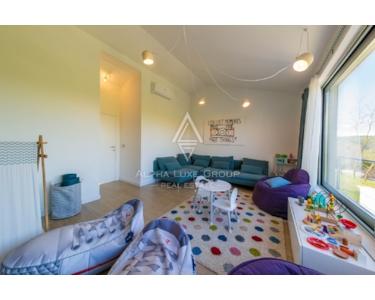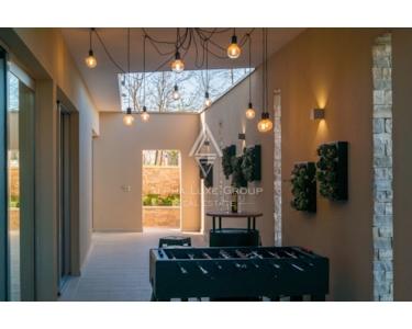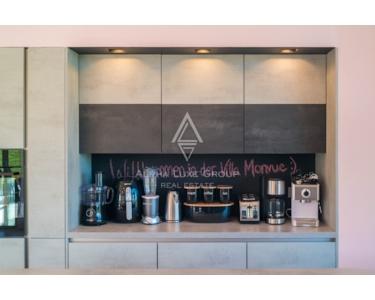 Vom Wohnbereich gelangt man auf eine Terrasse mit einem 22 m² großen, beheizten Pool. Daneben befinden sich ein Grill, ein Fernseher und ein komplettes Soundsystem – der ideale Ort zum Entspannen und geselligen Beisammensein. Ein Kinderspielzimmer bietet der Villa zusätzlichen Komfort für die ganze Familie.