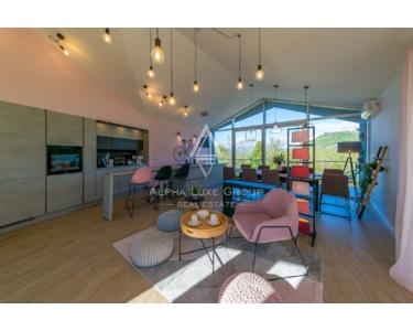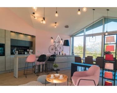 Im ersten Obergeschoss befinden sich eine offene Küche, ein Ess- und Wohnbereich, ein Gäste-WC, ein Arbeitszimmer (mit Umbaumöglichkeit), eine Terrasse und eine Loggia mit beeindruckender Aussicht.