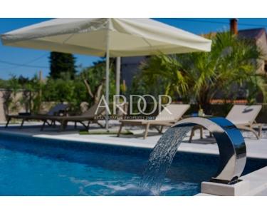 Der angelegte Außenbereich unterstreicht das luxuriöse Erlebnis zusätzlich. Ein Swimmingpool mit Whirlpool, eine großzügige Terrasse und eine voll ausgestattete Sommerküche laden dazu ein, lange Sonnentage und gesellige Abende im Freien zu genießen. Für maximalen Komfort wurde ein Kinderbereich eingerichtet, was diese Villa zu einer ausgezeichneten Wahl für Familienurlaube und -wohnen macht.