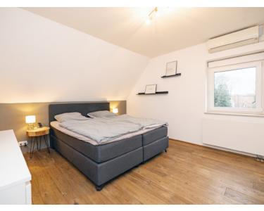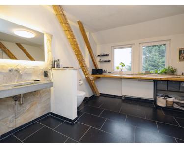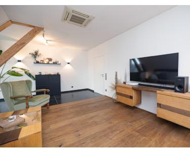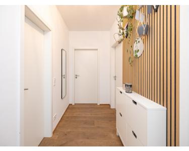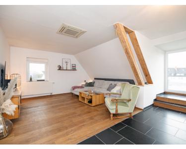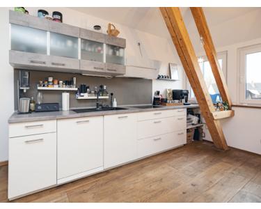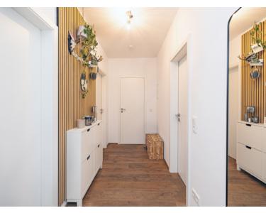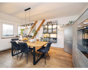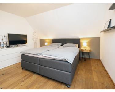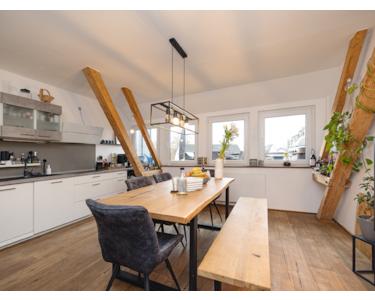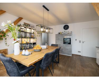 Im 2. Obergeschoss erwartet Sie ein durchdachtes Wohnkonzept, das Eleganz und höchsten Wohnkomfort vereint. Das Herzstück der Wohnung bildet der großzügige, lichtdurchflutete Wohnbereich mit direktem Zugang zur Dachterrasse, der Innen- und Außenraum auf harmonische Weise miteinander verbindet. Der hochwertige Innenausbau mit sichtbaren Deckenbalken, edlen Eichendielen, hochwertigen Innentüren und exklusiven Badarmaturen unterstreicht den gehobenen Anspruch dieser Immobilie und verleiht jedem Raum ein einzigartiges, warmes Ambiente.
