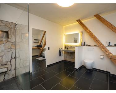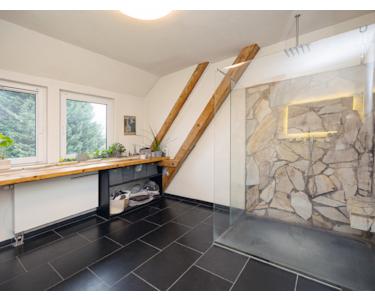 Das stilvolle Badezimmer überzeugt mit edlen Natursteinfliesen und einer großzügigen Walk-In-Dusche, die ein modernes Spa-Gefühl vermittelt. Eine Klimaanlage im Wohn- und Schlafzimmer sorgt ganzjährig für ein angenehmes Raumklima.