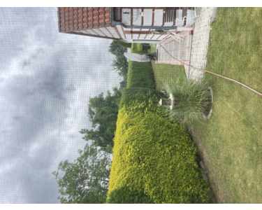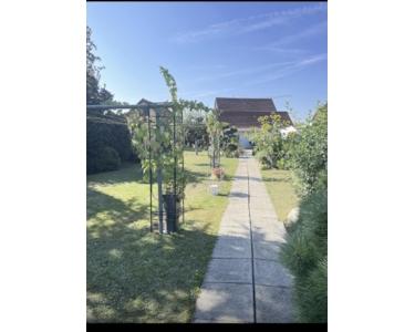 Schöne Lage in einer Sackgasse mit schönem Garten, Hochbeeten, Teich, großen Regenwasserzisternen und genehmigtem Gewächshaus, mit Garage im Nebengebäude.