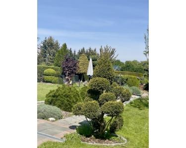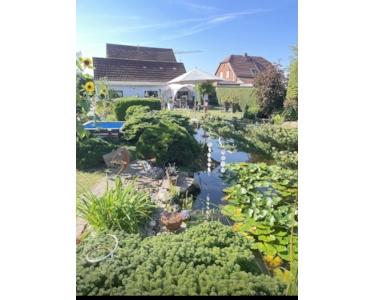 Der große Garten mit Teich und pflegeleichten Laub- und Nadelgehölzen bietet viel Platz zur Entspannung und freien Gestaltung.